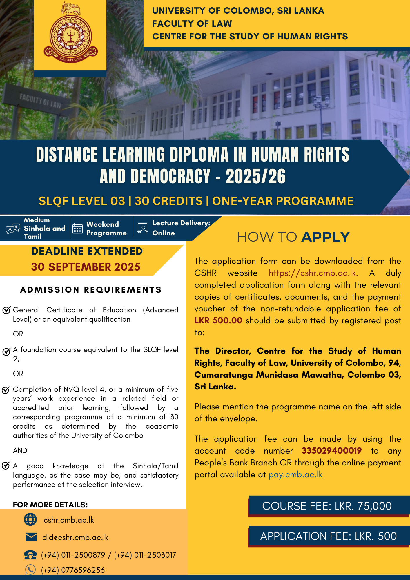 For more information contact: 0112500879 / dld@cshr.cmb.ac.lk